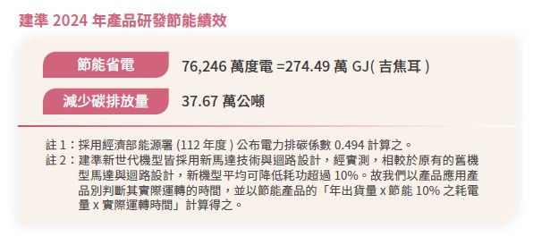 建準的諸多產品皆已陸續進行效能改良,並且被廣泛的應用於LED、工業/ 醫療、行動裝置、汽車、家電、通路客戶、雲端網通、電腦、辦公室設備、頭戴裝置等產業,2024年本公司來自能源效率相關產品的營收為124.52億元,為全球客戶節省7.62億度電,產品節能減碳之環保績效如下: