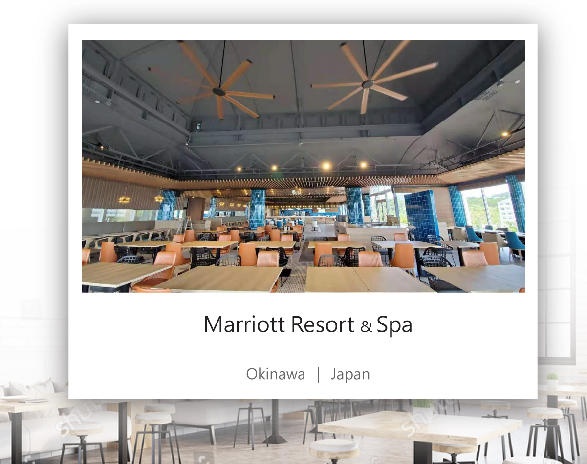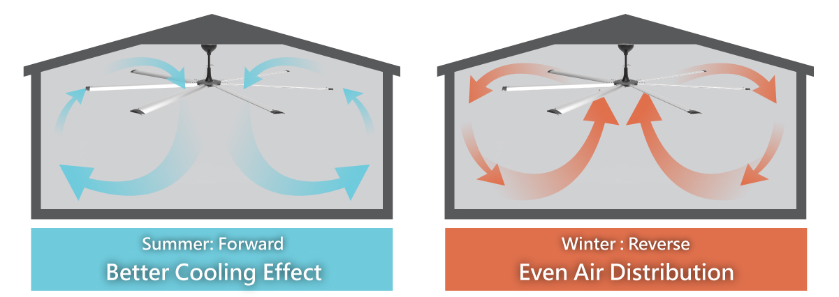 Powerful HVLS Fan series 1 resemble the natural breeze, it will generate the massive and smooth airflow. It can replace the AC and make occupants feel the 5-8 degrees temperature difference. Combine with the AC system, it reduces the costs. In the winter, the reverse mode can be switched to push down the warm air on the roof/ceiling, which achieves the effect of adjusting the temperature.