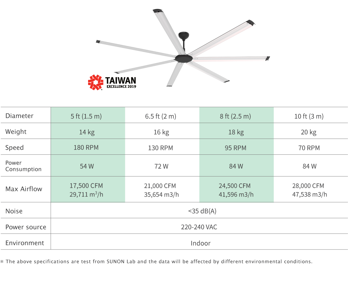 SUNON puts thinking about how to put environmental sustainability into practice in our production from selecting fan materials to packaging design. SUNON Powerful HVLS Fan Series 1 materials comply with the latest RoSH standard, using non-toxic and eco-friendly raw materials to shield our planet from further harmful waste pollution. Regarding package, instead of using low-cost styrofoam materials, we choose wrapping paper to pack our product because the material is recyclable and reusable, so that we can do our part to make our earth and ocean environment thrive.