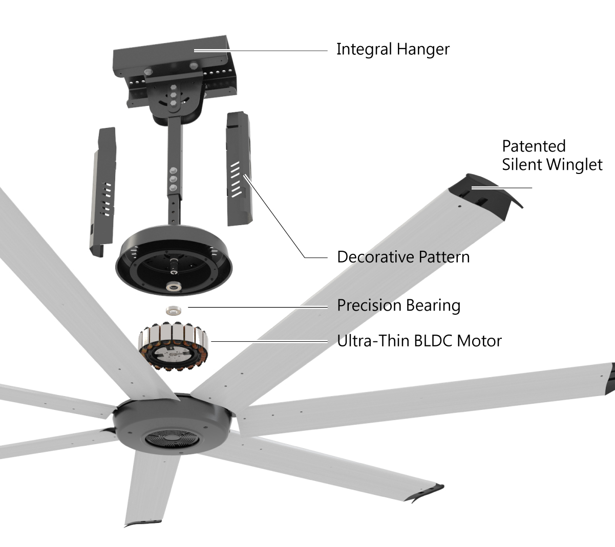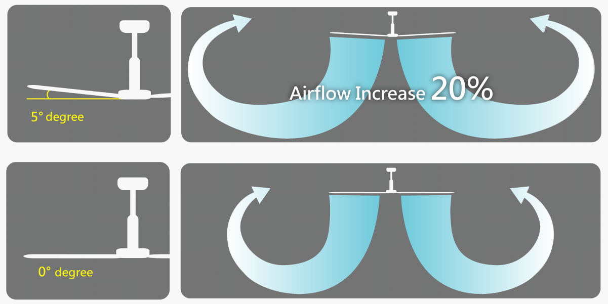 Powerful HVLS Fan airfoils are raised by 5 degrees, which can cover 20% more area than the regular 0-degree airfoils. Due to aerodynamic optimization, it is easier to have a more comfortable and even natural wind.