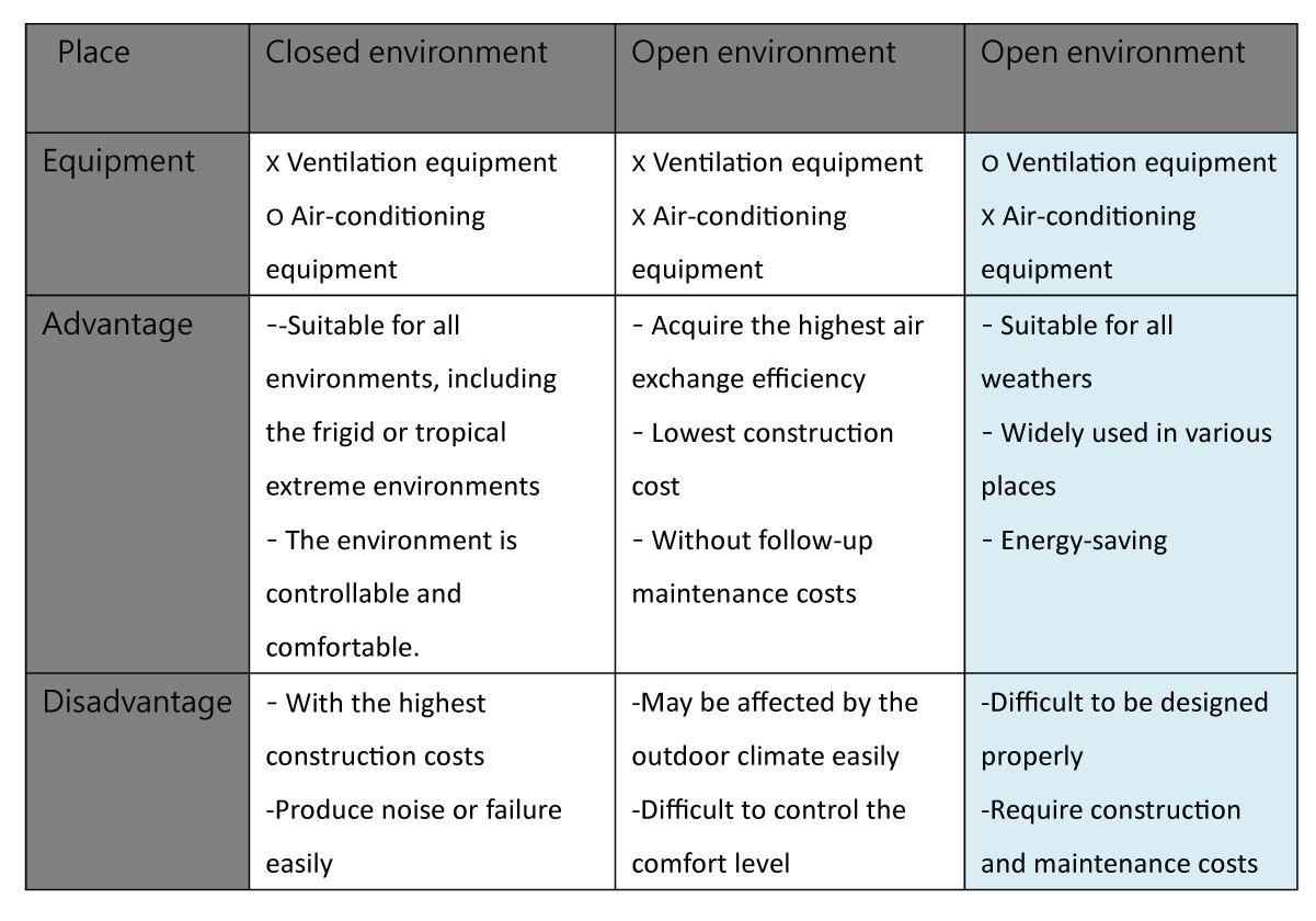 For those who are required to undergo household isolation or patients that are required to stay in the hospital, the most important point is to maintain the excellent ventilation and perfect indoor air quality. The research conducted by the WHO showed that installing multiple ceiling fans in the ward is conducive to the ventilation, and excellent ventilation is the key to reduce the disease infection risk. The following table demonstrated the comparison between the three common places, together with the advantage/disadvantage analysis. The table indicated that the best and most stable ventilation effect can be achieved when an open environment is equipped with adequate ventilation products.