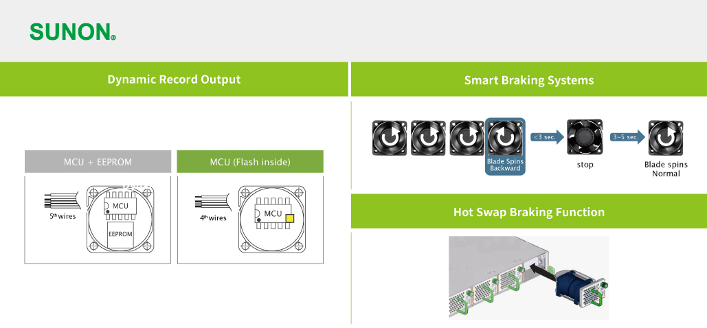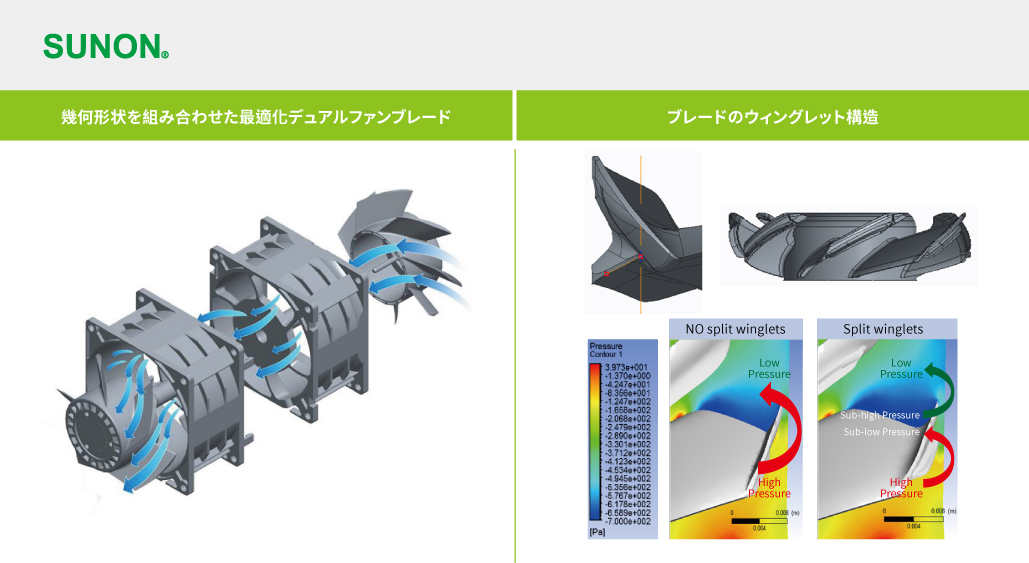 AIテクノロジーの発展に伴い、ハイパフォーマンスコンピューティング(HPC)は活用拡大し続けており、データセンター、サーバーの放熱及び省エネの問題が業界にとって重大な課題となっています。新世代のデータセンターでは高いコンピューティング能力を提供し続けるために液冷プレートを導入してGPUやCPUの温度を下げていますが、サーバー、スイッチングハブ、パワーサプライユニット(PSU)などを含むシステムは、筐体内の熱を外に排出し、効率的に放熱するために依然と多数の高効率ファンに依存しています。例えば、NVL-72 AIサーバーは、放熱するために液冷プレートに加えて 250個以上の高性能ファンを使用する必要があります。また、液冷システムのAALCサイドカーを接続するのにも、液冷システム内の高温水を冷却させてシステムに戻し再循環利用するためにはファンウォールが必要になります。 進化したA2L放熱設計 世界のAIデータセンターの発展の軌道に乗せることに成功 現代のデータセンターが求める大規模・高性能コンピューティング、環境に優しい持続可能性という未来ビジョンを満たすために、SUNONのAIファンシリーズにはより高効率な放熱能力を備えました。ダイレクトチップ冷却(D2C)やAALC サイドカーなどのSUNONのカスタマイズ液冷技術と組み合わせると、高密度なAIサーバーのワークロードにおいても、放熱・冷却、ダイナミック電流監視、ブレーキ保護など複数のメカニズムを迅速に動作させることが可能となります。SUNONのAIファンシリーズは国内外の多くのグローバルなサーバーやクラウドサービスのプロバイダーに好まれ、使用していただいています。米国の有名メーカのシングルエッジコンピューティングモジュールでは、標準ラックの放熱においてSUNON VGシリーズAIファン製品が60個ほど使用され、同シリーズファンは、台湾のサーバーメーカのハイエンドGPUコンピューティングの放熱にも使用されています。さらに、SUNONの超高性能XG-series Fan tray 4 in row for AIはCSPのお客様の1Uサーバーシステムで使用されており、XGシリーズのファンがNVIDIA GB200の放熱ソリューションで最適に使用されています。 ファンの設計を最適化 フローフィールドの改良でより高い放熱効率 SUNONのAIファンシリーズは、ファンブレードとフローフィールドの設計を最適化したことで、ファン効率が50%以上向上した大風量な超高速デュアルファンです。7ブレードの吸気ファンと、5ブレードの排気ファンと、ステータが一体になっており、フローフィールドの流れがスムーズになり分流が実現したことで、ウインドシアの影響を軽減しています。また、ブレードの尾翼に分裂ウィングレット構造をカスタマイズで追加し、渦の発生を低減でき、抵抗を大幅に減らすことで、より良い風量と風圧が得られ、チップから熱を即座に排除し蓄積を減らし、チップの動作温度を90℃以下に維持することができます。 SUNON AIファンには独自の制御技術を複数搭載 途切れることなく熱を放出する サーバーの放熱・冷却操作においては、電流の変化を効果的に監視するほか、省エネも実現する必要があります。SUNONのAIファンにはリアルタイムの電流監視機能が備わっており、高性能なMCUを設計に取り入れ、システムの端末に必要なリアルタイムの動的データ出力を提供し、常に放熱性能と省エネを最適化することでサーバーの高効率かつ安定した動作を確保しています。また、業界をリードする「モータ断電ブレーキ制御技術 (特許番号 I689150)」 を採用することで、電圧サージの発生を検出して直ぐにファンを停止させることができ、ファンの損傷を防止するだけでなく、ブレーキ時間とエネルギー消費を200%節約できます。さらに、AIファンシリーズには、ホットスワップ、バックアップシステム、起動ブレーキなどの技術機能が付いており、メインファンと補助ファンがシームレスに放熱動作を交替するので、ファンの寿命年数が伸び、サーバーコンピューティングを中断することなく動作させることができます。 SUNONはAIサーバーの放熱冷却システムの設計と開発を積極的に行っており、急速に変化するサーバー業界に対応するためにファン技術の改善を行い続けています。AALCサイドカー、RPUシステム、CDU システムなどの液冷技術もより集中的に研究開発を進めています。サーバーのコンピューティングパフォーマンスを向上させ、エネルギーの使用効率を最適化できる全方位的な放熱・冷却ソリューションは、最新のAIデータセンターにとって経済的で根本的なソリューションであり、多くの市場とお客様の様々なニーズに適用でき、企業と共に持続可能な運営目標を達成します。 SUNONの液冷テクノロジー製品情報はこちらから>> AIファンシリーズ製品スペック
